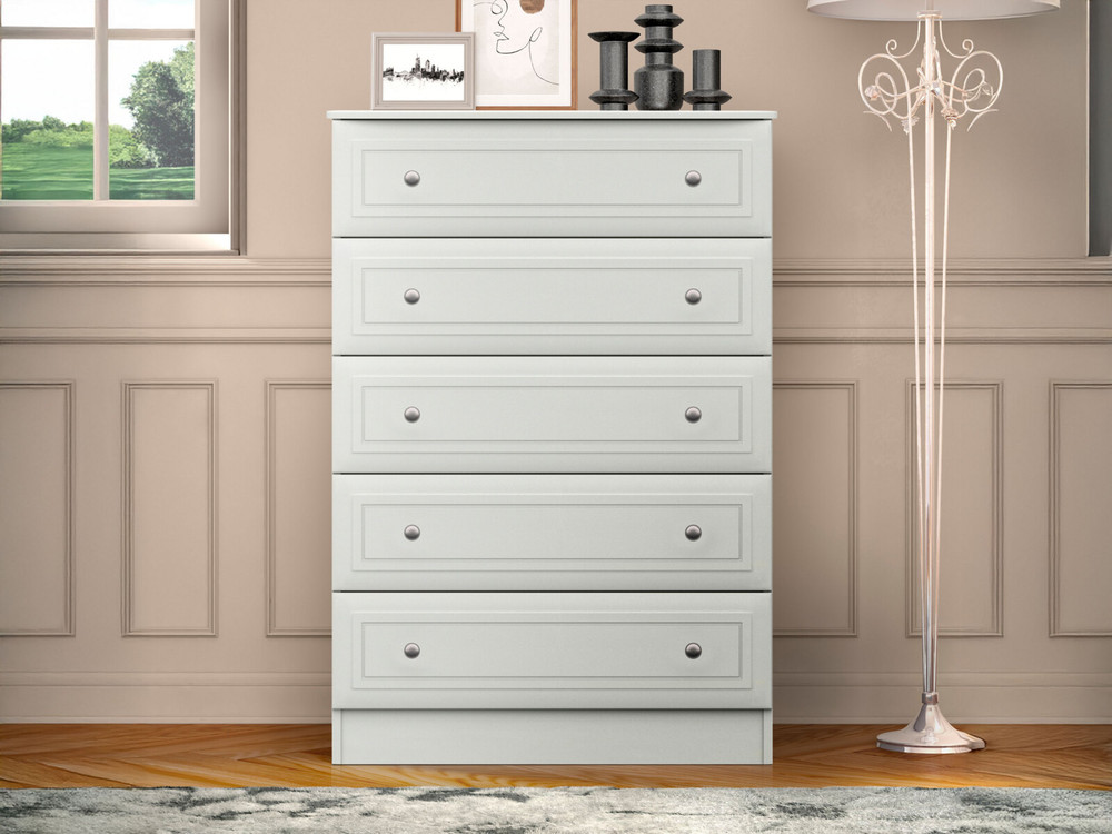 Crafted with clean bevelled edges and finished in your choice of two sophisticated colours — white or mink — this tall chest of drawers brings both visual appeal and practical storage to your space. Whether you're refreshing your bedroom or completing the Carson collection, this piece fits seamlessly into a wide variety of interiors.