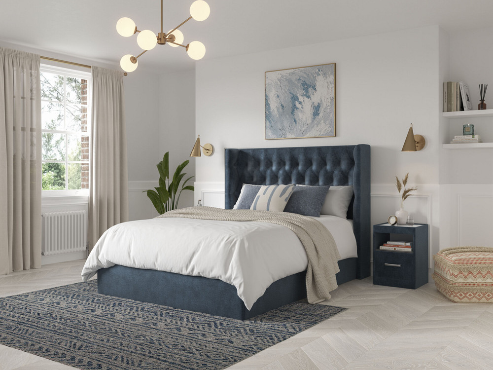 This bedframe is available in 3 sizes – double bed, king size bed, and super king size bed. There’s also a matching bedside cabinet upholstered in the same fabric, to complete your bedroom collection.