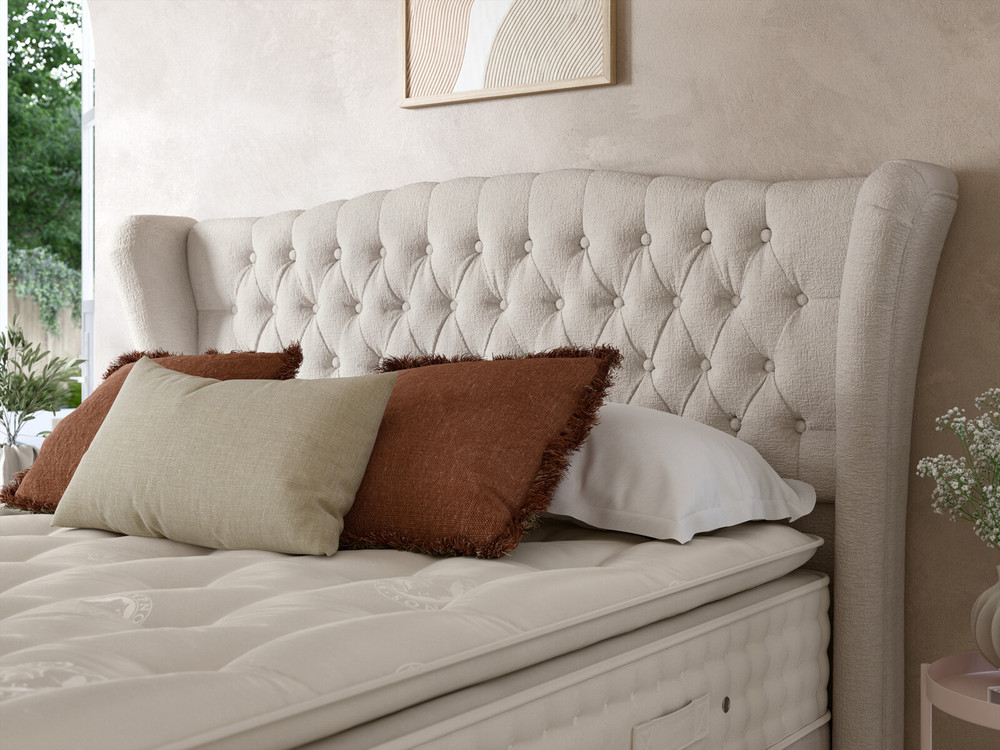 • Deep buttoned, arched, winged design - A statement piece for any bedroom, fashioned with crafted pleats